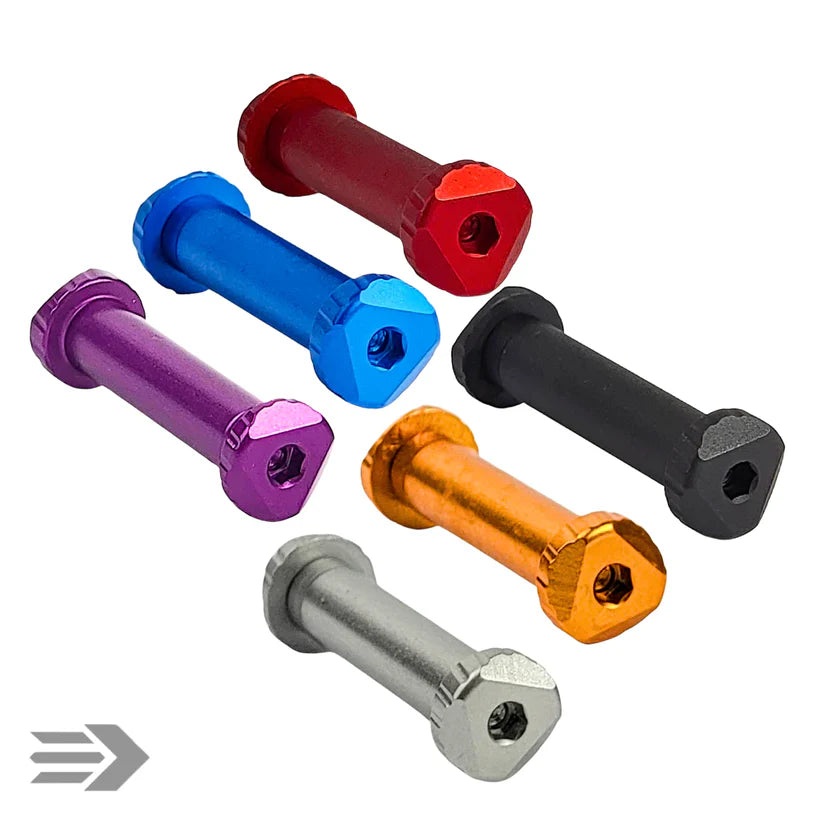 The Flux body pin is our replacement for the stock tension-based pin in any M4-pattern lower. This durable 2-piece screw design ensures that your pins won't be going anywhere while providing a beautiful CNC accent!