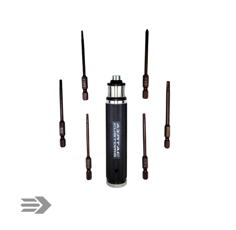 The AirTac Ultimate Toolkit is a durable screwdriver kit with 6 interchangeable bits (stored inside the handle!), all of which are implemented in our very own AirTac products. Whether you're working on a CRBN Upper, Gearbox, or simply just need a screwdriver, this is all you'll need to reach for.